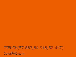 CIELCh 57.883,84.918,52.417 Color is a normal orange color and the nearest color is Spanish Orange #e86100. Hex code #ec5e00 and RGB value is rgb(236,94,0). In RGB color space, this color is composed of 93% red, 37% green, 0% blue, In CMYK color space, this color is composed of 0% cyan, 60% magenta, 100% yellow , 7% black , In HSL color space, this color has a hue angle of 24° , 100% saturation and 46% lightness.