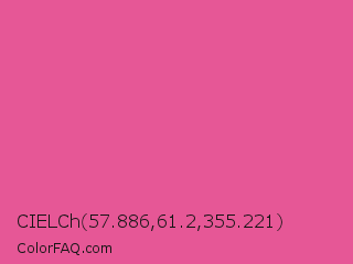 CIELCh 57.886,61.2,355.221 Color is a light rose color and the nearest color is Raspberry Pink #e25098. Hex code #e65796 and RGB value is rgb(230,87,150). In RGB color space, this color is composed of 90% red, 34% green, 59% blue, In CMYK color space, this color is composed of 0% cyan, 62% magenta, 35% yellow , 10% black , In HSL color space, this color has a hue angle of 334° , 74% saturation and 62% lightness.