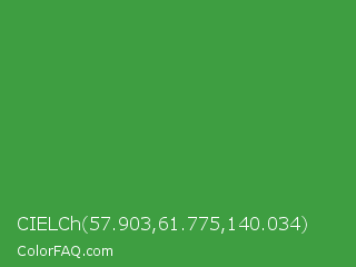 CIELCh 57.903,61.775,140.034 Color is a normal green color and the nearest color is May Green #4c9141. Hex code #3e9e41 and RGB value is rgb(62,158,65). In RGB color space, this color is composed of 24% red, 62% green, 25% blue, In CMYK color space, this color is composed of 61% cyan, 0% magenta, 59% yellow , 38% black , In HSL color space, this color has a hue angle of 122° , 44% saturation and 43% lightness.