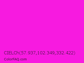 CIELCh 57.937,102.349,332.422 Color is a normal magenta color and the nearest color is Hot Magenta #ff1dce. Hex code #f71ae0 and RGB value is rgb(247,26,224). In RGB color space, this color is composed of 97% red, 10% green, 88% blue, In CMYK color space, this color is composed of 0% cyan, 89% magenta, 9% yellow , 3% black , In HSL color space, this color has a hue angle of 306° , 93% saturation and 54% lightness.