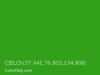 CIELCh 57.941,76.803,134.808 Color is a normal green color and the nearest color is Slimy Green #299617. Hex code #32a01b and RGB value is rgb(50,160,27). In RGB color space, this color is composed of 20% red, 63% green, 11% blue, In CMYK color space, this color is composed of 69% cyan, 0% magenta, 83% yellow , 37% black , In HSL color space, this color has a hue angle of 110° , 71% saturation and 37% lightness.