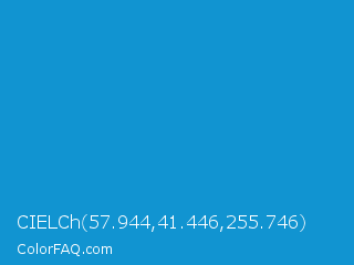 CIELCh 57.944,41.446,255.746 Color is a normal blue color and the nearest color is Rich Electric Blue #0892d0. Hex code #1194d1 and RGB value is rgb(17,148,209). In RGB color space, this color is composed of 7% red, 58% green, 82% blue, In CMYK color space, this color is composed of 92% cyan, 29% magenta, 0% yellow , 18% black , In HSL color space, this color has a hue angle of 199° , 85% saturation and 44% lightness.