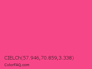 CIELCh 57.946,70.859,3.338 Color is a light rose color and the nearest color is Violet Red #f7468a. Hex code #f74687 and RGB value is rgb(247,70,135). In RGB color space, this color is composed of 97% red, 27% green, 53% blue, In CMYK color space, this color is composed of 0% cyan, 72% magenta, 45% yellow , 3% black , In HSL color space, this color has a hue angle of 338° , 92% saturation and 62% lightness.