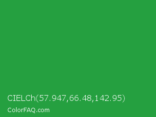 CIELCh 57.947,66.48,142.95 Color is a normal green color and the nearest color is Wageningen Green #34b233. Hex code #25a040 and RGB value is rgb(37,160,64). In RGB color space, this color is composed of 15% red, 63% green, 25% blue, In CMYK color space, this color is composed of 77% cyan, 0% magenta, 60% yellow , 37% black , In HSL color space, this color has a hue angle of 133° , 62% saturation and 39% lightness.