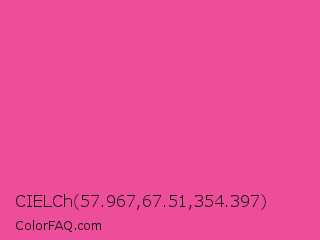 CIELCh 57.967,67.51,354.397 Color is a light rose color and the nearest color is Violet Red #f75394. Hex code #ee4e99 and RGB value is rgb(238,78,153). In RGB color space, this color is composed of 93% red, 31% green, 60% blue, In CMYK color space, this color is composed of 0% cyan, 67% magenta, 36% yellow , 7% black , In HSL color space, this color has a hue angle of 332° , 82% saturation and 62% lightness.