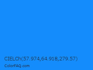 CIELCh 57.974,64.918,279.57 Color is a normal blue color and the nearest color is Dodger Blue #1e90ff. Hex code #148cfc and RGB value is rgb(20,140,252). In RGB color space, this color is composed of 8% red, 55% green, 99% blue, In CMYK color space, this color is composed of 92% cyan, 44% magenta, 0% yellow , 1% black , In HSL color space, this color has a hue angle of 209° , 97% saturation and 53% lightness.