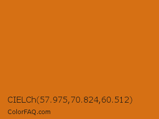 CIELCh 57.975,70.824,60.512 Color is a normal orange color and the nearest color is Hot Cinnamon #d2691e. Hex code #d67014 and RGB value is rgb(214,112,20). In RGB color space, this color is composed of 84% red, 44% green, 8% blue, In CMYK color space, this color is composed of 0% cyan, 48% magenta, 91% yellow , 16% black , In HSL color space, this color has a hue angle of 28° , 83% saturation and 46% lightness.