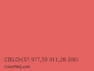 CIELCh 57.977,55.911,28.206 Color is a light red color and the nearest color is Roman #de6360. Hex code #e26360 and RGB value is rgb(226,99,96). In RGB color space, this color is composed of 89% red, 39% green, 38% blue, In CMYK color space, this color is composed of 0% cyan, 56% magenta, 58% yellow , 11% black , In HSL color space, this color has a hue angle of 1° , 69% saturation and 63% lightness.