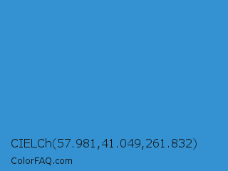 CIELCh 57.981,41.049,261.832 Color is a normal blue color and the nearest color is Curious Blue #2596d1. Hex code #3492d2 and RGB value is rgb(52,146,210). In RGB color space, this color is composed of 20% red, 57% green, 82% blue, In CMYK color space, this color is composed of 75% cyan, 30% magenta, 0% yellow , 18% black , In HSL color space, this color has a hue angle of 204° , 64% saturation and 51% lightness.