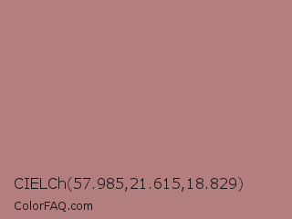 CIELCh 57.985,21.615,18.829 Color is a normal red color and the nearest color is Turkish Rose #b57281. Hex code #b27e80 and RGB value is rgb(178,126,128). In RGB color space, this color is composed of 70% red, 49% green, 50% blue, In CMYK color space, this color is composed of 0% cyan, 29% magenta, 28% yellow , 30% black , In HSL color space, this color has a hue angle of 358° , 25% saturation and 60% lightness.