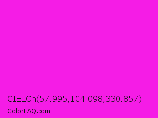 CIELCh 57.995,104.098,330.857 Color is a normal magenta color and the nearest color is Hot Magenta #ff1dce. Hex code #f51ce6 and RGB value is rgb(245,28,230). In RGB color space, this color is composed of 96% red, 11% green, 90% blue, In CMYK color space, this color is composed of 0% cyan, 89% magenta, 6% yellow , 4% black , In HSL color space, this color has a hue angle of 304° , 92% saturation and 54% lightness.