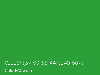 CIELCh 57.99,68.447,140.687 Color is a normal green color and the nearest color is Wageningen Green #34b233. Hex code #2ba039 and RGB value is rgb(43,160,57). In RGB color space, this color is composed of 17% red, 63% green, 22% blue, In CMYK color space, this color is composed of 73% cyan, 0% magenta, 64% yellow , 37% black , In HSL color space, this color has a hue angle of 127° , 58% saturation and 40% lightness.