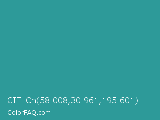CIELCh 58.008,30.961,195.601 Color is a normal cyan color and the nearest color is Zomp #39a78e. Hex code #2d9a99 and RGB value is rgb(45,154,153). In RGB color space, this color is composed of 18% red, 60% green, 60% blue, In CMYK color space, this color is composed of 71% cyan, 0% magenta, 1% yellow , 40% black , In HSL color space, this color has a hue angle of 179° , 55% saturation and 39% lightness.