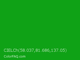 CIELCh 58.037,81.686,137.05 Color is a normal green color and the nearest color is Slimy Green #299617. Hex code #0fa216 and RGB value is rgb(15,162,22). In RGB color space, this color is composed of 6% red, 64% green, 9% blue, In CMYK color space, this color is composed of 91% cyan, 0% magenta, 86% yellow , 36% black , In HSL color space, this color has a hue angle of 123° , 83% saturation and 35% lightness.