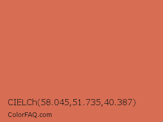 CIELCh 58.045,51.735,40.387 Color is a normal red color and the nearest color is Copper Red #cb6d51. Hex code #d76d53 and RGB value is rgb(215,109,83). In RGB color space, this color is composed of 84% red, 43% green, 33% blue, In CMYK color space, this color is composed of 0% cyan, 49% magenta, 61% yellow , 16% black , In HSL color space, this color has a hue angle of 12° , 62% saturation and 58% lightness.