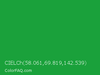 CIELCh 58.061,69.819,142.539 Color is a normal green color and the nearest color is North Texas Green #059033. Hex code #1aa13b and RGB value is rgb(26,161,59). In RGB color space, this color is composed of 10% red, 63% green, 23% blue, In CMYK color space, this color is composed of 84% cyan, 0% magenta, 63% yellow , 37% black , In HSL color space, this color has a hue angle of 135° , 72% saturation and 37% lightness.