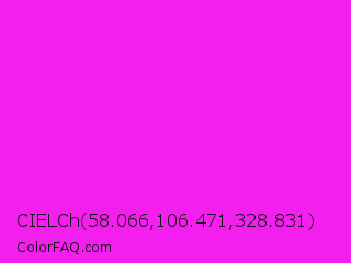 CIELCh 58.066,106.471,328.831 Color is a normal magenta color and the nearest color is Hot Magenta #ff1dce. Hex code #f21fee and RGB value is rgb(242,31,238). In RGB color space, this color is composed of 95% red, 12% green, 93% blue, In CMYK color space, this color is composed of 0% cyan, 87% magenta, 2% yellow , 5% black , In HSL color space, this color has a hue angle of 301° , 89% saturation and 54% lightness.