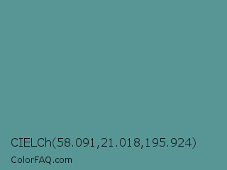 CIELCh 58.091,21.018,195.924 Color is a normal cyan color and the nearest color is Patina #639a8f. Hex code #589695 and RGB value is rgb(88,150,149). In RGB color space, this color is composed of 35% red, 59% green, 58% blue, In CMYK color space, this color is composed of 41% cyan, 0% magenta, 1% yellow , 41% black , In HSL color space, this color has a hue angle of 179° , 26% saturation and 47% lightness.