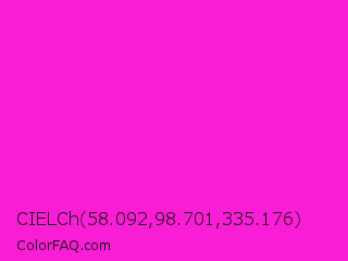 CIELCh 58.092,98.701,335.176 Color is a normal magenta color and the nearest color is Hot Magenta #ff1dce. Hex code #fa1dd6 and RGB value is rgb(250,29,214). In RGB color space, this color is composed of 98% red, 11% green, 84% blue, In CMYK color space, this color is composed of 0% cyan, 88% magenta, 14% yellow , 2% black , In HSL color space, this color has a hue angle of 310° , 96% saturation and 55% lightness.
