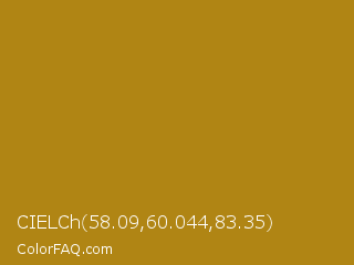 CIELCh 58.09,60.044,83.35 Color is a normal orange color and the nearest color is Dark Goldenrod #b8860b. Hex code #b08514 and RGB value is rgb(176,133,20). In RGB color space, this color is composed of 69% red, 52% green, 8% blue, In CMYK color space, this color is composed of 0% cyan, 24% magenta, 89% yellow , 31% black , In HSL color space, this color has a hue angle of 43° , 80% saturation and 38% lightness.