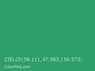 CIELCh 58.111,47.583,156.573 Color is a normal green color and the nearest color is Illuminating Emerald #319177. Hex code #2f9e69 and RGB value is rgb(47,158,105). In RGB color space, this color is composed of 18% red, 62% green, 41% blue, In CMYK color space, this color is composed of 70% cyan, 0% magenta, 34% yellow , 38% black , In HSL color space, this color has a hue angle of 151° , 54% saturation and 40% lightness.
