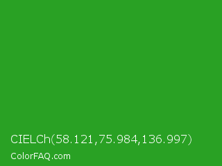 CIELCh 58.121,75.984,136.997 Color is a normal green color and the nearest color is Slimy Green #299617. Hex code #29a124 and RGB value is rgb(41,161,36). In RGB color space, this color is composed of 16% red, 63% green, 14% blue, In CMYK color space, this color is composed of 75% cyan, 0% magenta, 78% yellow , 37% black , In HSL color space, this color has a hue angle of 118° , 63% saturation and 39% lightness.