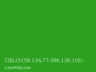 CIELCh 58.134,77.096,136.106 Color is a normal green color and the nearest color is Slimy Green #299617. Hex code #2ba11f and RGB value is rgb(43,161,31). In RGB color space, this color is composed of 17% red, 63% green, 12% blue, In CMYK color space, this color is composed of 73% cyan, 0% magenta, 81% yellow , 37% black , In HSL color space, this color has a hue angle of 114° , 68% saturation and 38% lightness.