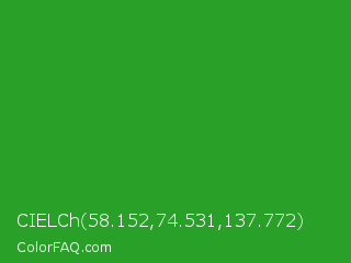 CIELCh 58.152,74.531,137.772 Color is a normal green color and the nearest color is Slimy Green #299617. Hex code #29a129 and RGB value is rgb(41,161,41). In RGB color space, this color is composed of 16% red, 63% green, 16% blue, In CMYK color space, this color is composed of 75% cyan, 0% magenta, 75% yellow , 37% black , In HSL color space, this color has a hue angle of 120° , 59% saturation and 40% lightness.