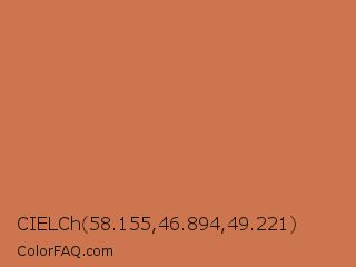 CIELCh 58.155,46.894,49.221 Color is a normal orange color and the nearest color is Copper Red #cb6d51. Hex code #cc754f and RGB value is rgb(204,117,79). In RGB color space, this color is composed of 80% red, 46% green, 31% blue, In CMYK color space, this color is composed of 0% cyan, 43% magenta, 61% yellow , 20% black , In HSL color space, this color has a hue angle of 18° , 55% saturation and 55% lightness.