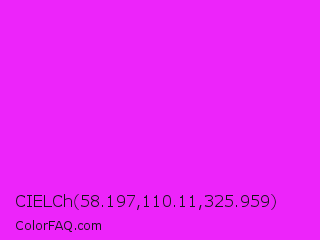 CIELCh 58.197,110.11,325.959 Color is a normal magenta color and the nearest color is Phlox #df00ff. Hex code #ed24fa and RGB value is rgb(237,36,250). In RGB color space, this color is composed of 93% red, 14% green, 98% blue, In CMYK color space, this color is composed of 5% cyan, 86% magenta, 0% yellow , 2% black , In HSL color space, this color has a hue angle of 296° , 96% saturation and 56% lightness.