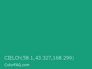 CIELCh 58.1,43.327,168.299 Color is a normal cyan color and the nearest color is Green Crayola #1cac78. Hex code #179e7b and RGB value is rgb(23,158,123). In RGB color space, this color is composed of 9% red, 62% green, 48% blue, In CMYK color space, this color is composed of 85% cyan, 0% magenta, 22% yellow , 38% black , In HSL color space, this color has a hue angle of 164° , 75% saturation and 35% lightness.