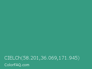CIELCh 58.201,36.069,171.945 Color is a normal cyan color and the nearest color is Illuminating Emerald #319177. Hex code #369c82 and RGB value is rgb(54,156,130). In RGB color space, this color is composed of 21% red, 61% green, 51% blue, In CMYK color space, this color is composed of 65% cyan, 0% magenta, 17% yellow , 39% black , In HSL color space, this color has a hue angle of 165° , 49% saturation and 41% lightness.