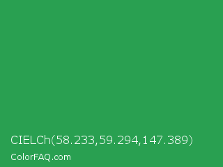 CIELCh 58.233,59.294,147.389 Color is a normal green color and the nearest color is Sea Green #2e8b57. Hex code #29a051 and RGB value is rgb(41,160,81). In RGB color space, this color is composed of 16% red, 63% green, 32% blue, In CMYK color space, this color is composed of 74% cyan, 0% magenta, 49% yellow , 37% black , In HSL color space, this color has a hue angle of 140° , 59% saturation and 39% lightness.