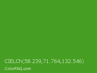 CIELCh 58.239,71.764,132.546 Color is a normal green color and the nearest color is Vida Loca #549019. Hex code #469f22 and RGB value is rgb(70,159,34). In RGB color space, this color is composed of 27% red, 62% green, 13% blue, In CMYK color space, this color is composed of 56% cyan, 0% magenta, 79% yellow , 38% black , In HSL color space, this color has a hue angle of 103° , 65% saturation and 38% lightness.