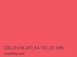 CIELCh 58.267,64.731,23.198 Color is a light red color and the nearest color is Carnation #f95a61. Hex code #f05763 and RGB value is rgb(240,87,99). In RGB color space, this color is composed of 94% red, 34% green, 39% blue, In CMYK color space, this color is composed of 0% cyan, 64% magenta, 59% yellow , 6% black , In HSL color space, this color has a hue angle of 355° , 84% saturation and 64% lightness.