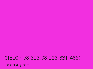 CIELCh 58.313,98.123,331.486 Color is a normal magenta color and the nearest color is Razzle Dazzle Rose #ff33cc. Hex code #f22fe0 and RGB value is rgb(242,47,224). In RGB color space, this color is composed of 95% red, 18% green, 88% blue, In CMYK color space, this color is composed of 0% cyan, 81% magenta, 7% yellow , 5% black , In HSL color space, this color has a hue angle of 306° , 88% saturation and 57% lightness.
