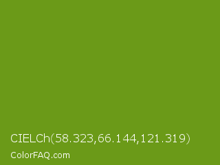 CIELCh 58.323,66.144,121.319 Color is a normal green color and the nearest color is Christi #67a712. Hex code #6b9a18 and RGB value is rgb(107,154,24). In RGB color space, this color is composed of 42% red, 60% green, 9% blue, In CMYK color space, this color is composed of 31% cyan, 0% magenta, 84% yellow , 40% black , In HSL color space, this color has a hue angle of 82° , 73% saturation and 35% lightness.
