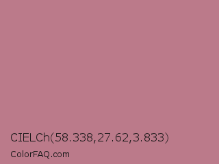 CIELCh 58.338,27.62,3.833 Color is a light red color and the nearest color is Old Rose #c08081. Hex code #bb7a8a and RGB value is rgb(187,122,138). In RGB color space, this color is composed of 73% red, 48% green, 54% blue, In CMYK color space, this color is composed of 0% cyan, 35% magenta, 26% yellow , 27% black , In HSL color space, this color has a hue angle of 345° , 32% saturation and 61% lightness.