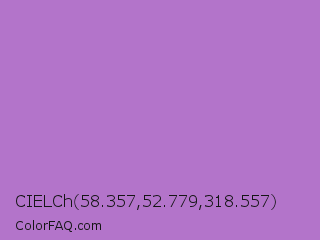 CIELCh 58.357,52.779,318.557 Color is a light purple color and the nearest color is Rich Lavender #a76bcf. Hex code #b374ca and RGB value is rgb(179,116,202). In RGB color space, this color is composed of 70% red, 45% green, 79% blue, In CMYK color space, this color is composed of 11% cyan, 43% magenta, 0% yellow , 21% black , In HSL color space, this color has a hue angle of 284° , 45% saturation and 62% lightness.