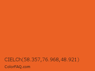 CIELCh 58.357,76.968,48.921 Color is a normal orange color and the nearest color is Vivid Vermilion #e56024. Hex code #eb6124 and RGB value is rgb(235,97,36). In RGB color space, this color is composed of 92% red, 38% green, 14% blue, In CMYK color space, this color is composed of 0% cyan, 59% magenta, 85% yellow , 8% black , In HSL color space, this color has a hue angle of 18° , 83% saturation and 53% lightness.