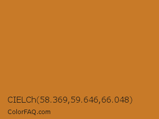 CIELCh 58.369,59.646,66.048 Color is a normal orange color and the nearest color is Ochre #cc7722. Hex code #c87a28 and RGB value is rgb(200,122,40). In RGB color space, this color is composed of 78% red, 48% green, 16% blue, In CMYK color space, this color is composed of 0% cyan, 39% magenta, 80% yellow , 22% black , In HSL color space, this color has a hue angle of 31° , 67% saturation and 47% lightness.