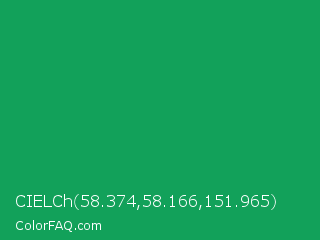 CIELCh 58.374,58.166,151.965 Color is a normal green color and the nearest color is Shamrock Green #009e60. Hex code #12a15a and RGB value is rgb(18,161,90). In RGB color space, this color is composed of 7% red, 63% green, 35% blue, In CMYK color space, this color is composed of 89% cyan, 0% magenta, 44% yellow , 37% black , In HSL color space, this color has a hue angle of 150° , 80% saturation and 35% lightness.