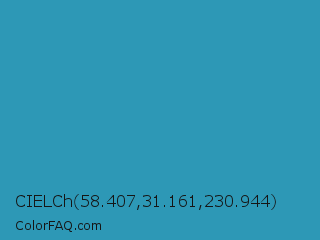 CIELCh 58.407,31.161,230.944 Color is a normal cyan color and the nearest color is Boston Blue #3b91b4. Hex code #2d98b6 and RGB value is rgb(45,152,182). In RGB color space, this color is composed of 18% red, 60% green, 71% blue, In CMYK color space, this color is composed of 75% cyan, 16% magenta, 0% yellow , 29% black , In HSL color space, this color has a hue angle of 193° , 60% saturation and 45% lightness.