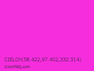 CIELCh 58.422,97.402,332.514 Color is a normal magenta color and the nearest color is Razzle Dazzle Rose #ff33cc. Hex code #f42edd and RGB value is rgb(244,46,221). In RGB color space, this color is composed of 96% red, 18% green, 87% blue, In CMYK color space, this color is composed of 0% cyan, 81% magenta, 9% yellow , 4% black , In HSL color space, this color has a hue angle of 307° , 90% saturation and 57% lightness.