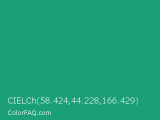 CIELCh 58.424,44.228,166.429 Color is a normal green color and the nearest color is Green Crayola #1cac78. Hex code #1b9f79 and RGB value is rgb(27,159,121). In RGB color space, this color is composed of 11% red, 62% green, 47% blue, In CMYK color space, this color is composed of 83% cyan, 0% magenta, 24% yellow , 38% black , In HSL color space, this color has a hue angle of 163° , 71% saturation and 36% lightness.