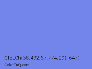 CIELCh 58.432,57.774,291.647 Color is a light blue color and the nearest color is Cornflower Blue #6495ed. Hex code #7385eb and RGB value is rgb(115,133,235). In RGB color space, this color is composed of 45% red, 52% green, 92% blue, In CMYK color space, this color is composed of 51% cyan, 43% magenta, 0% yellow , 8% black , In HSL color space, this color has a hue angle of 231° , 75% saturation and 69% lightness.