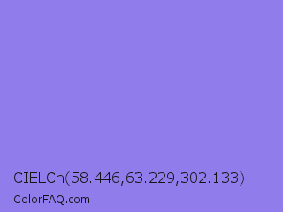 CIELCh 58.446,63.229,302.133 Color is a light indigo color and the nearest color is Medium Purple #9370db. Hex code #917ceb and RGB value is rgb(145,124,235). In RGB color space, this color is composed of 57% red, 49% green, 92% blue, In CMYK color space, this color is composed of 38% cyan, 47% magenta, 0% yellow , 8% black , In HSL color space, this color has a hue angle of 251° , 74% saturation and 70% lightness.