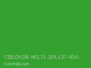 CIELCh 58.463,71.204,137.404 Color is a normal green color and the nearest color is Wageningen Green #34b233. Hex code #35a12f and RGB value is rgb(53,161,47). In RGB color space, this color is composed of 21% red, 63% green, 18% blue, In CMYK color space, this color is composed of 67% cyan, 0% magenta, 71% yellow , 37% black , In HSL color space, this color has a hue angle of 117° , 55% saturation and 41% lightness.