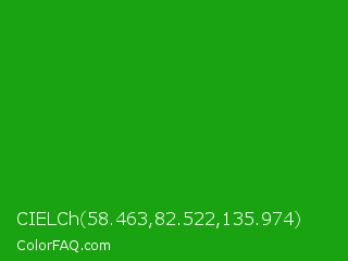 CIELCh 58.463,82.522,135.974 Color is a normal green color and the nearest color is Slimy Green #299617. Hex code #1aa310 and RGB value is rgb(26,163,16). In RGB color space, this color is composed of 10% red, 64% green, 6% blue, In CMYK color space, this color is composed of 84% cyan, 0% magenta, 90% yellow , 36% black , In HSL color space, this color has a hue angle of 116° , 82% saturation and 35% lightness.