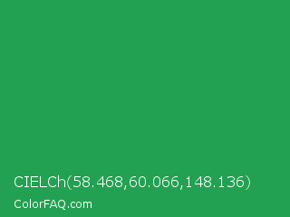 CIELCh 58.468,60.066,148.136 Color is a normal green color and the nearest color is Eucalyptus #278a5b. Hex code #23a152 and RGB value is rgb(35,161,82). In RGB color space, this color is composed of 14% red, 63% green, 32% blue, In CMYK color space, this color is composed of 78% cyan, 0% magenta, 49% yellow , 37% black , In HSL color space, this color has a hue angle of 142° , 64% saturation and 38% lightness.